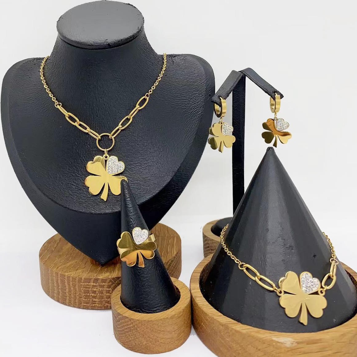 18K Gold Plated Lucky Clover Jewelry Set Stainless Steel Necklace Earrings Bracelet Ring 4 Piece Wedding Engagement Jewelry for Women