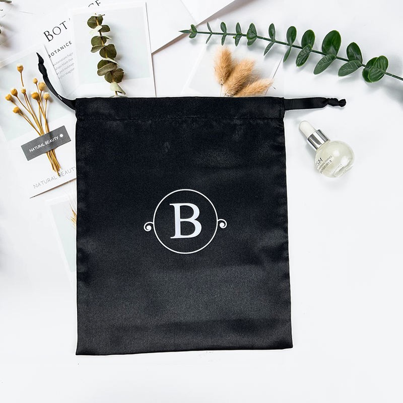Alphabet Black Satin Bag with Ribbon Drawstring Pouch for Jewelry Shoes Storage
