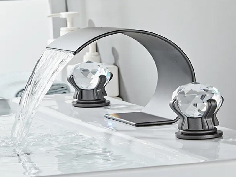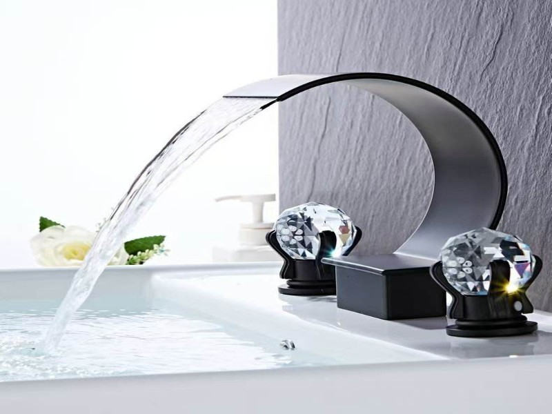 It is a waterfall bathroom faucet with a 3-hole widespread design and 2 handles.
