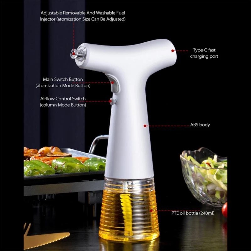 The electric oil spray bottle works by generating a fine mist of oil that can be used to coat pans, dishes, or food. It uses a pump to generate the spray and is powered by a rechargeable battery. The nozzle can be adjusted to control the amount of mist that is sprayed.