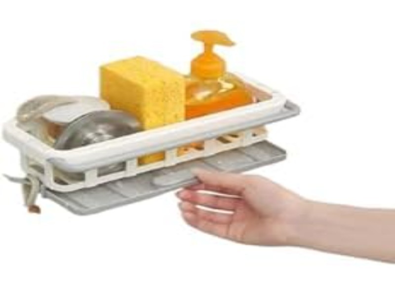 Hanging Retractable Sink Drain Rack with Sponge Tray and Drying Basket Adjustable Kitchen and Bathroom Sink Organizer for Soap Towel and Scrubber Storage.