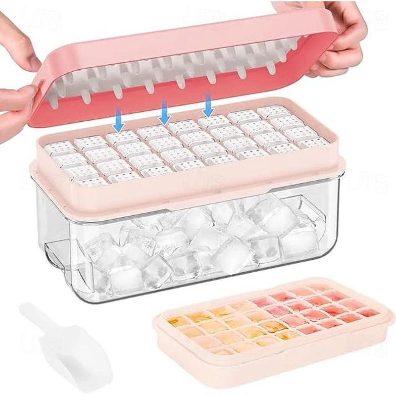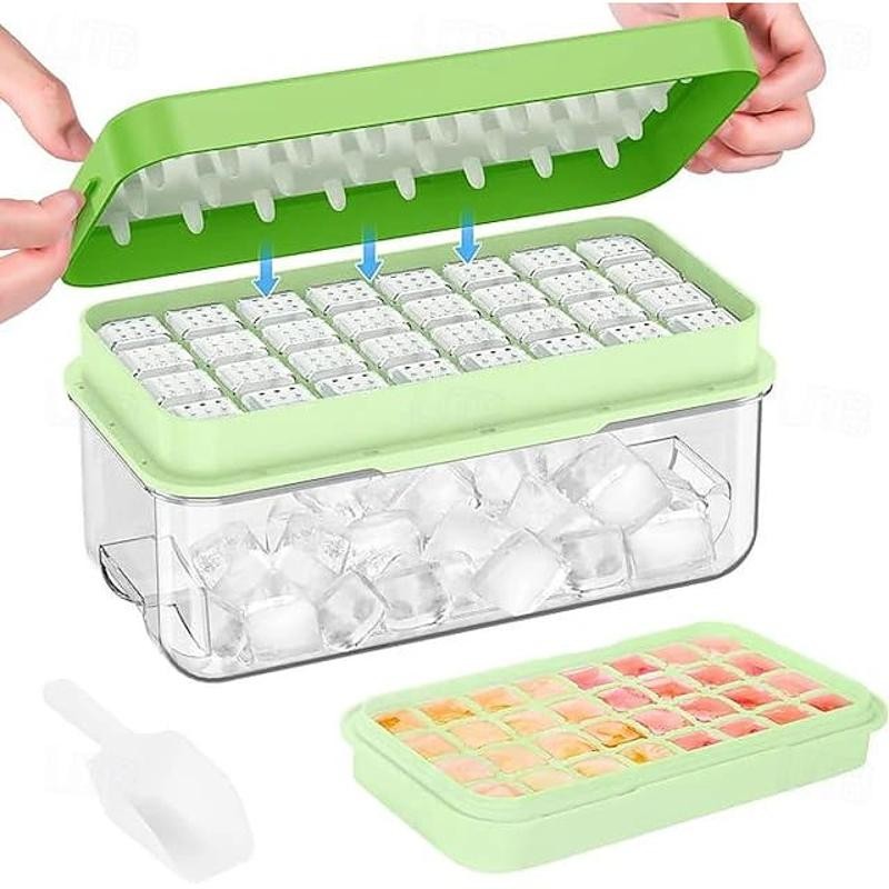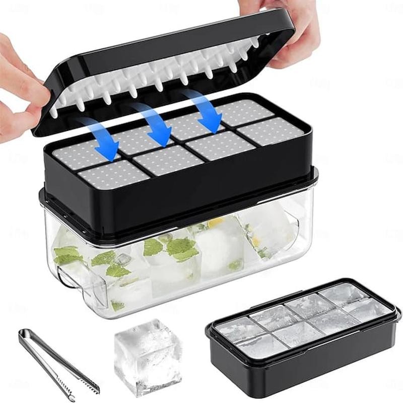The set typically includes a large ice cube tray, a lid to prevent spills and odors, a storage bin to keep the ice organized, and a tong for hygienic handling.