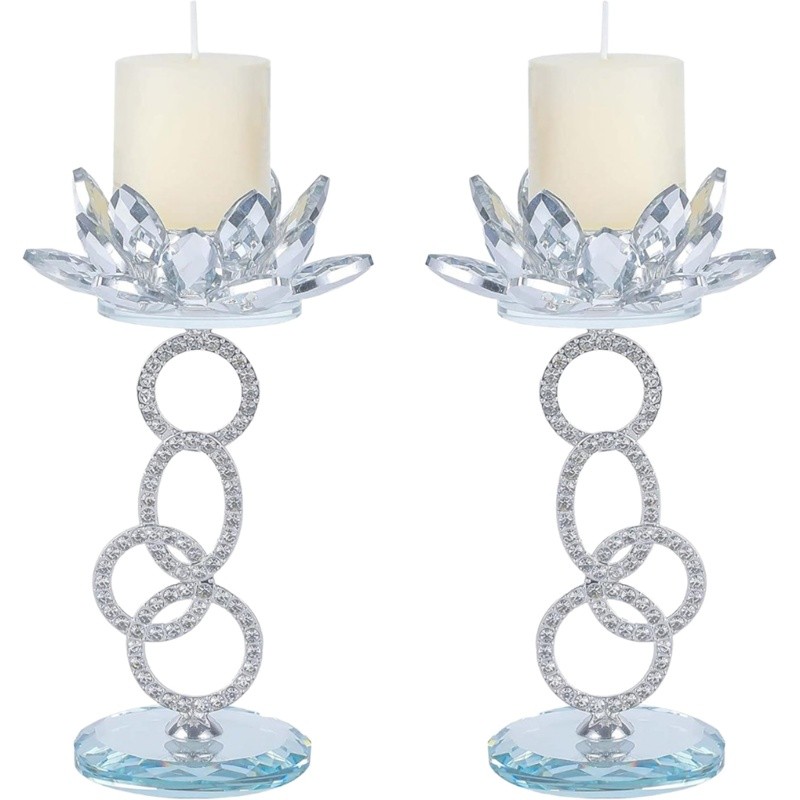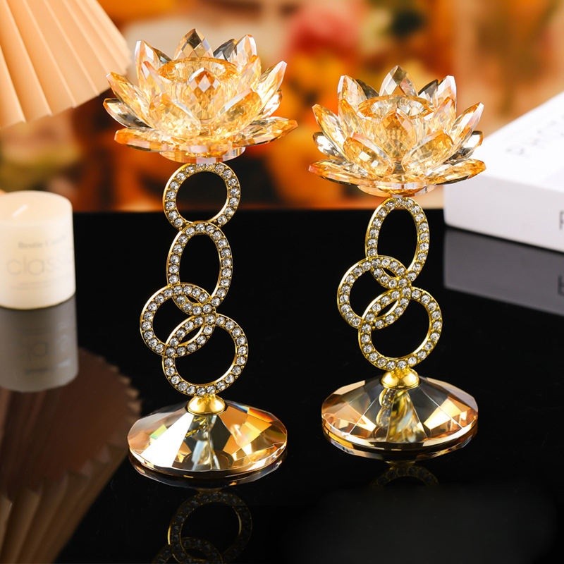 The candle holder features crystal glass petals with a durable metal base finished in a golden coating, giving it a luxurious and decorative appearance.