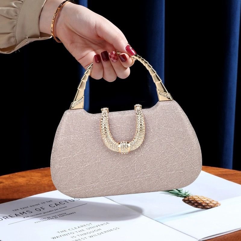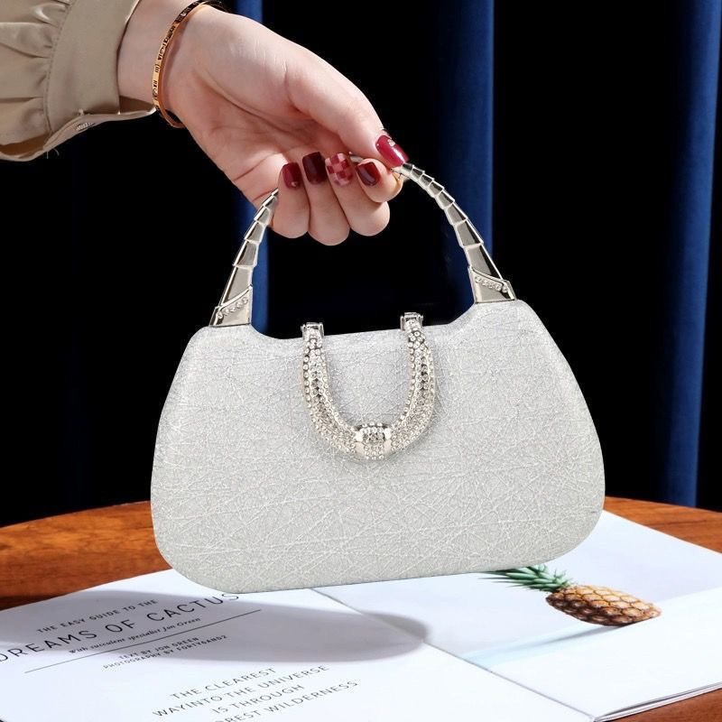 It’s an elegant banquet bag adorned with pearls and diamond-like decorations.