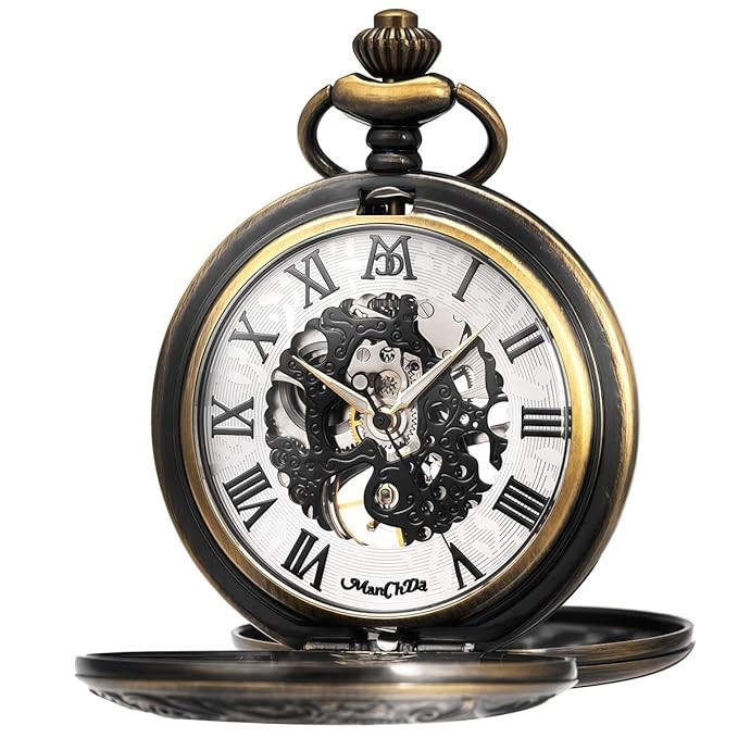 ManChDa Mechanical Roman Numerals Dial Skeleton Pocket Watches with Box and Chains for Mens Women