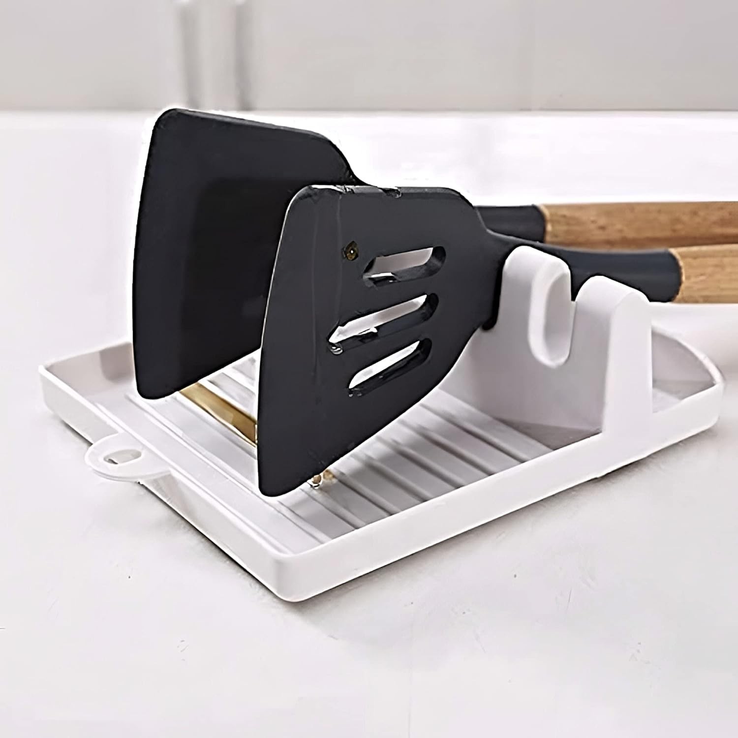 This tray is designed with 4 dedicated slots, allowing you to rest multiple utensils—such as a spatula, soup ladle, tasting spoon, and a pair of chopsticks—simultaneously. It’s a great space-saver for busy stovetops.