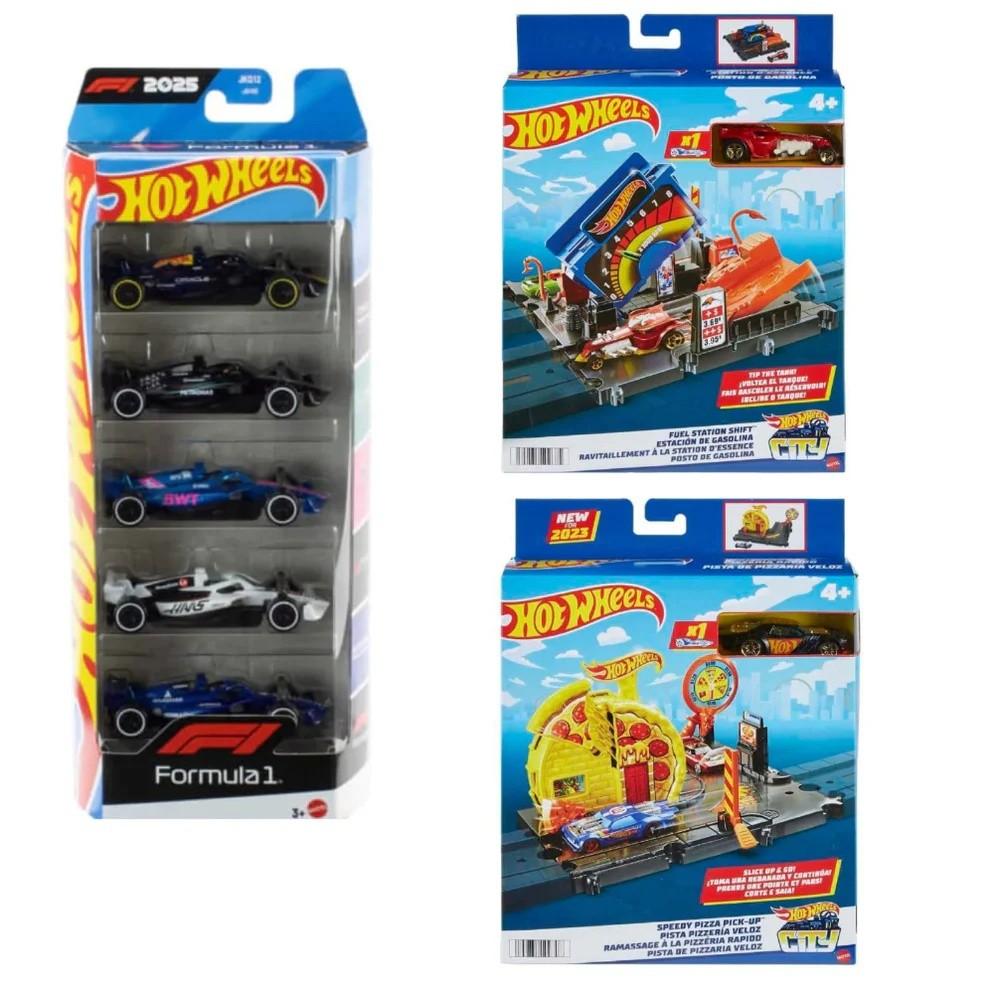 The set includes 5 Formula 1 die-cast cars along with Fuel Station Shift and Speedy Pizza Pick-Up playsets.
