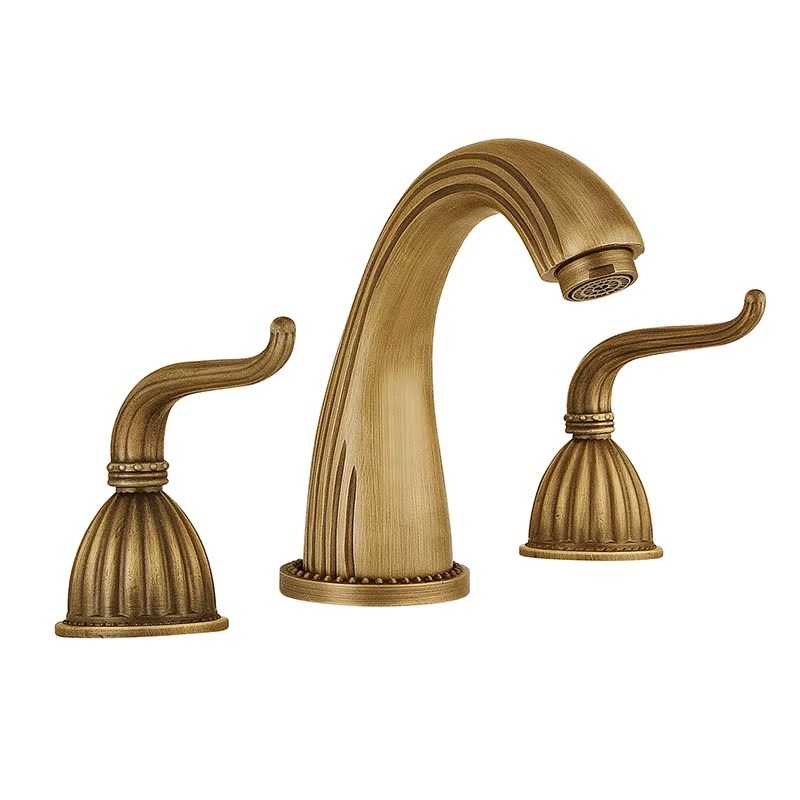 Widespread Bathroom Sink Mixer Faucet Vintage Brass 3 Hole Basin Tap, Dual Handle Deck Mounted Retro Style Wash Basin Tap with Hot and Cold Water Hose