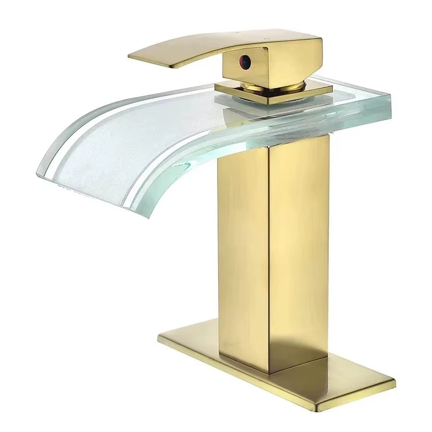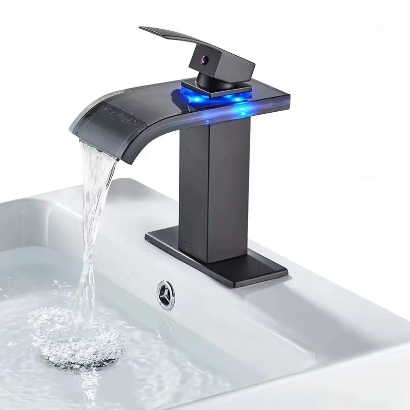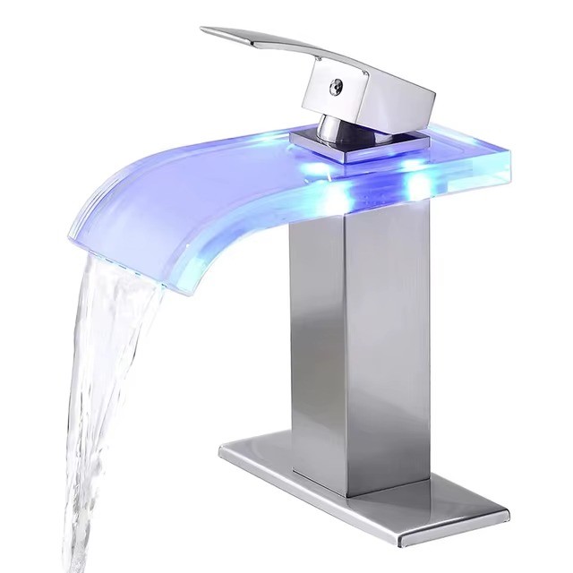 LED Bathroom Sink Mixer Faucet Waterfall Spout Tall Vessel Basin Tap Single Handle One Hole Brass Mixer Tap with Temperature Color Changing Light for Washroom