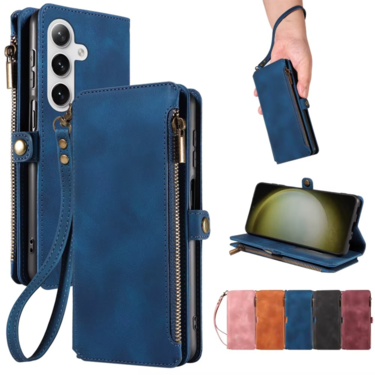 Zipper Wallet Case for Samsung Galaxy S26 Ultra PU Leather Flip Cover 7 Card Slots Embossed Flower Wrist Strap Lanyard Kickstand Shockproof Blue