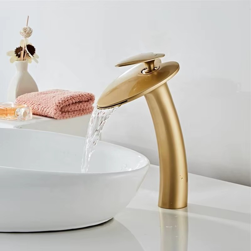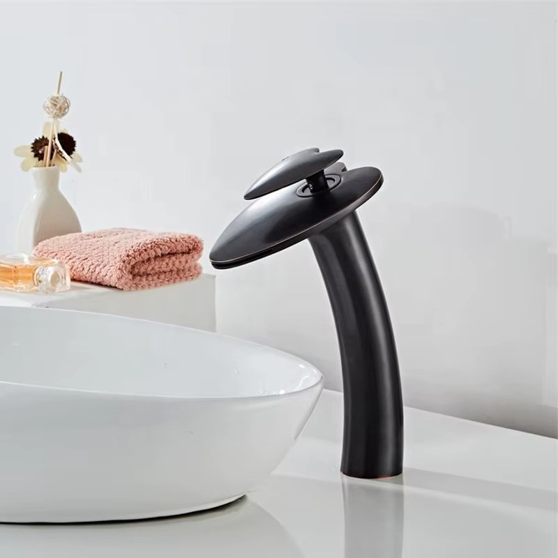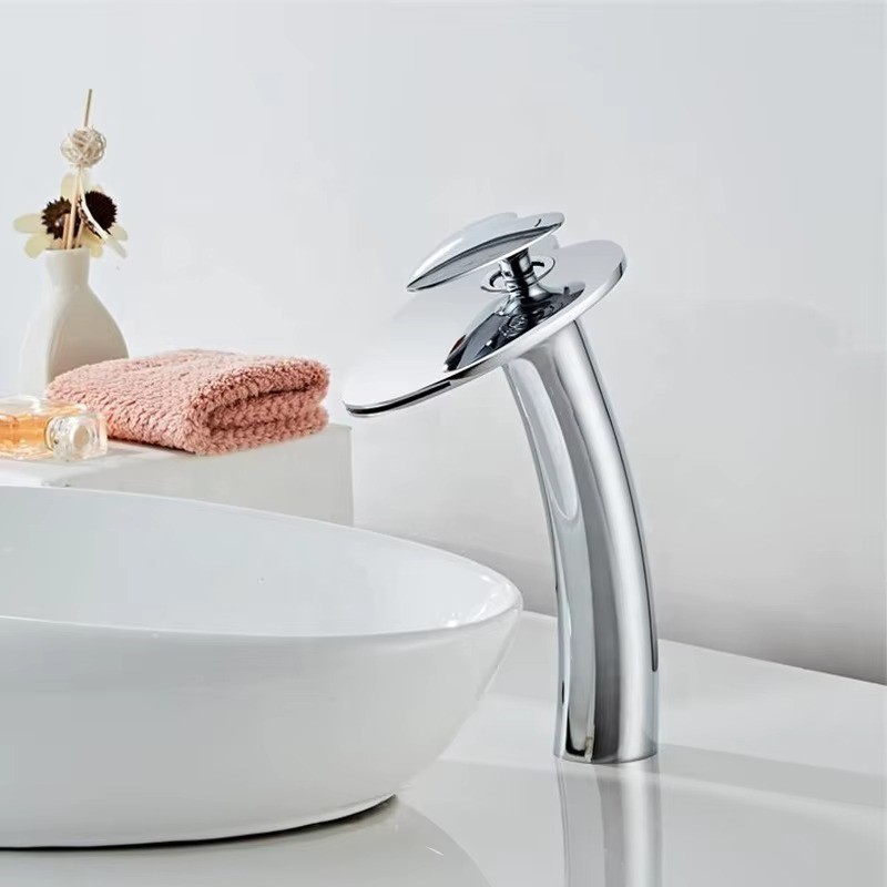Waterfall Bathroom Sink Mixer Faucet Tall Body Single Handle Single Hole Vessel Basin Tap Slanted Design Lavatory Mixer Tap with Hot and Cold Water Supply Hose