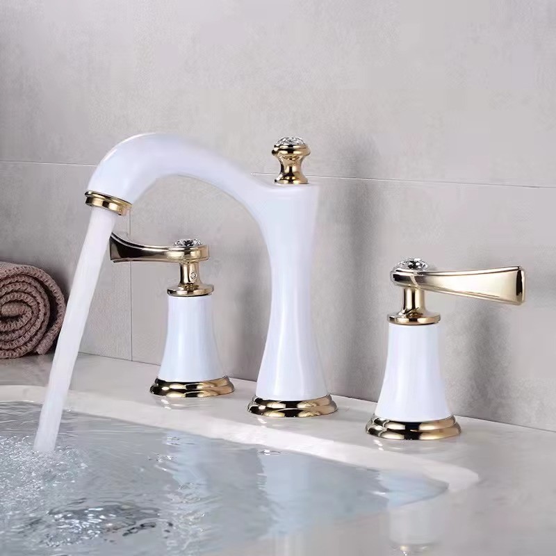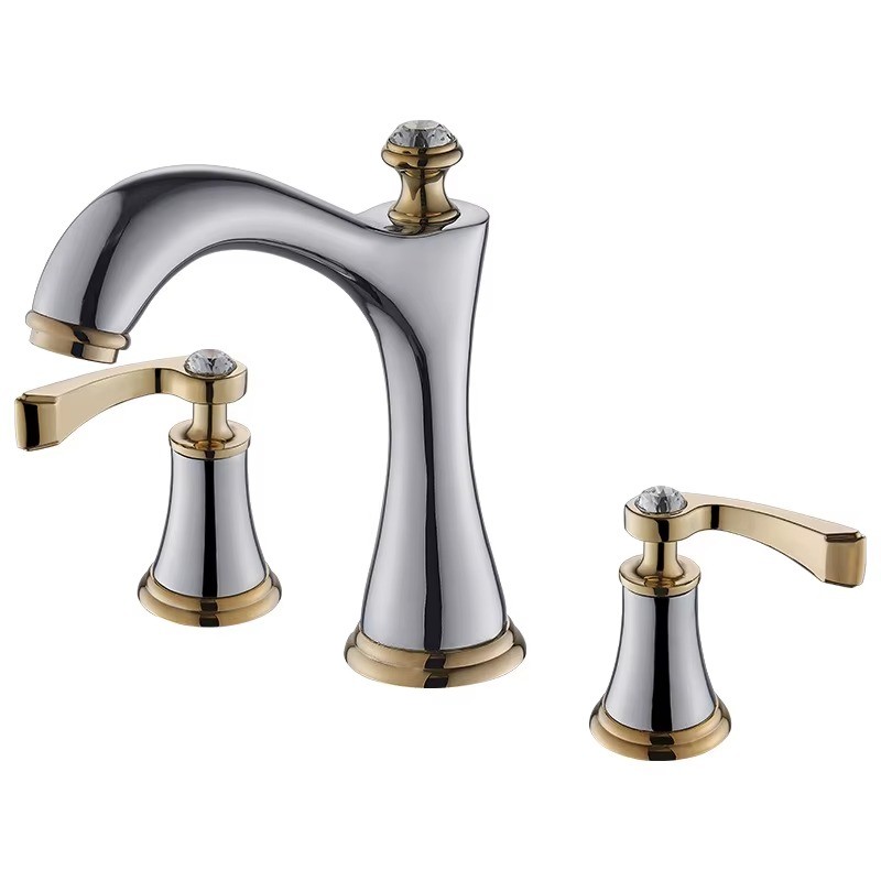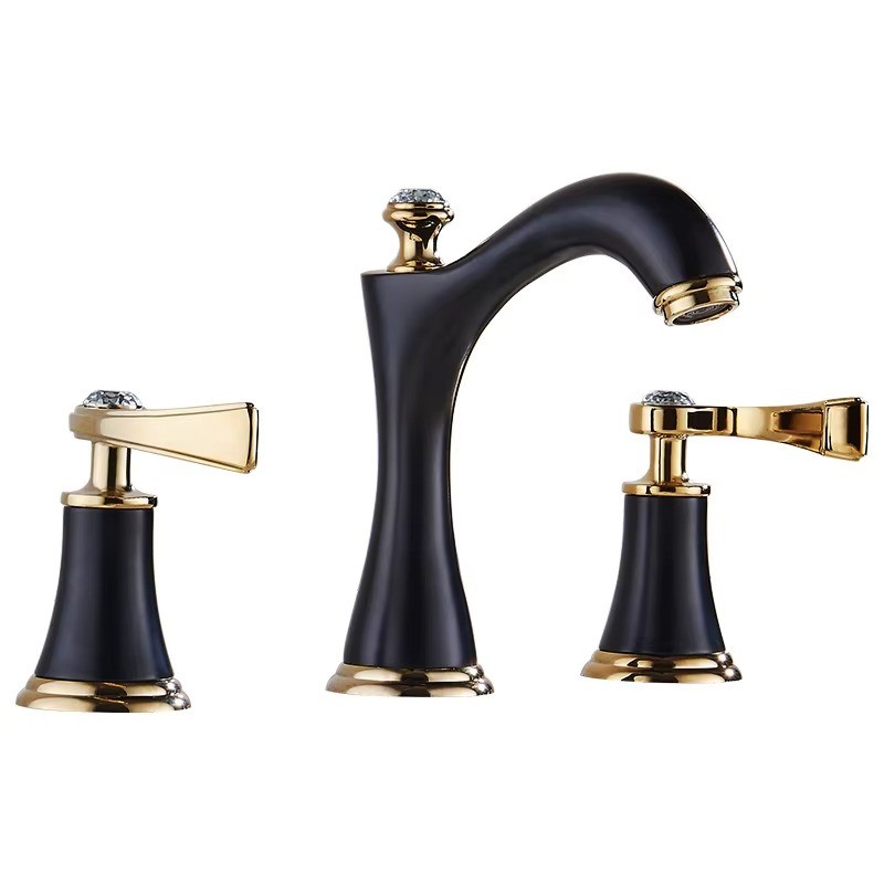 Luxury Widespread Bathroom Sink Mixer Faucet Vintage Brass Three Hole Dual Handle Basin Tap Deck Mounted Rotatable Spout Washroom Vessel Water Tap with Hot and Cold Hose