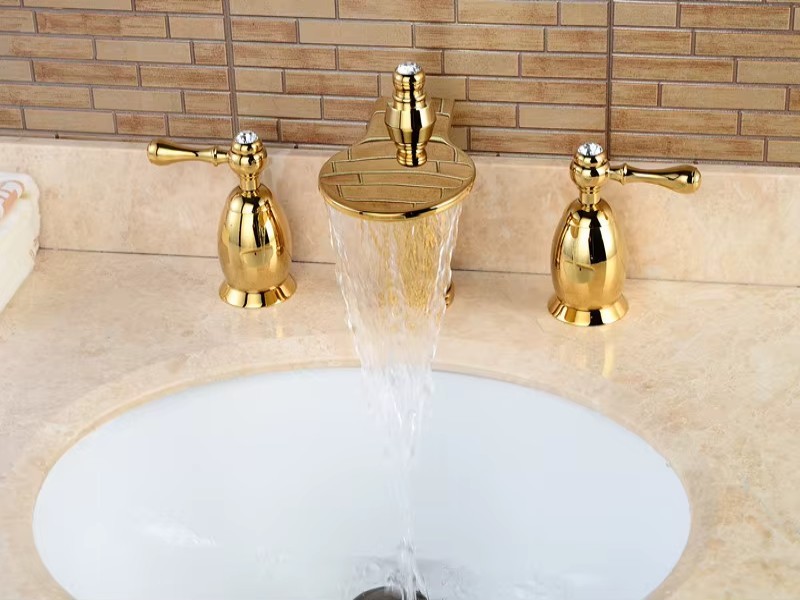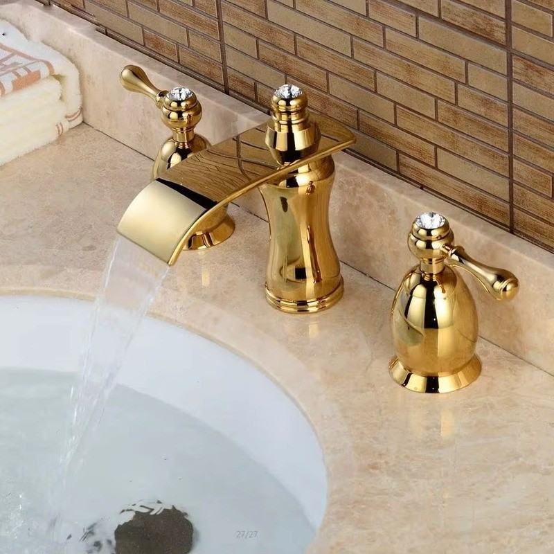 Widespread Bathroom Sink Mixer Faucet Gold Brass Three Hole Two Handle Deck Mounted Basin Tap Hot and Cold Water Mixer for Vessel Wash Basin Modern Washroom Use