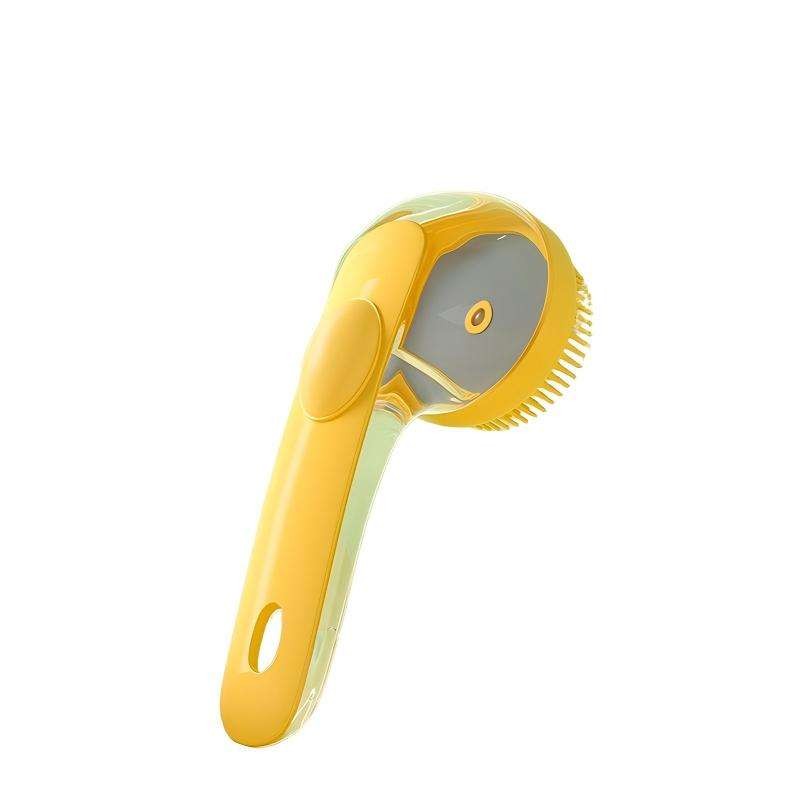 The brush has a built-in reservoir that you fill with shampoo; simply press the top or squeeze the brush to release the soap through the bristles as you scrub.