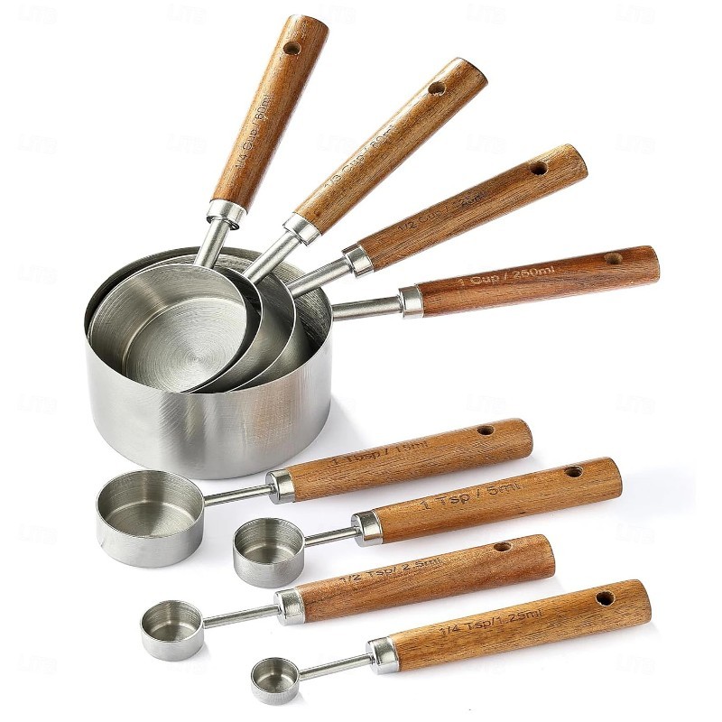 Stainless Steel Measuring Cups and Spoons Set with Wooden Handle Nesting Kitchen Measuring Tools for Baking Cooking Food Preparation and Daily Use