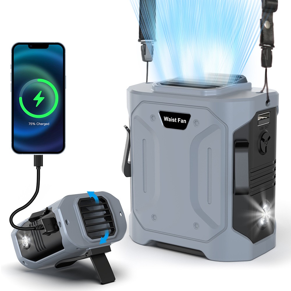 This is a portable mini USB fan designed to be worn around the waist or neck, providing strong airflow during outdoor activities, workouts, or travel.