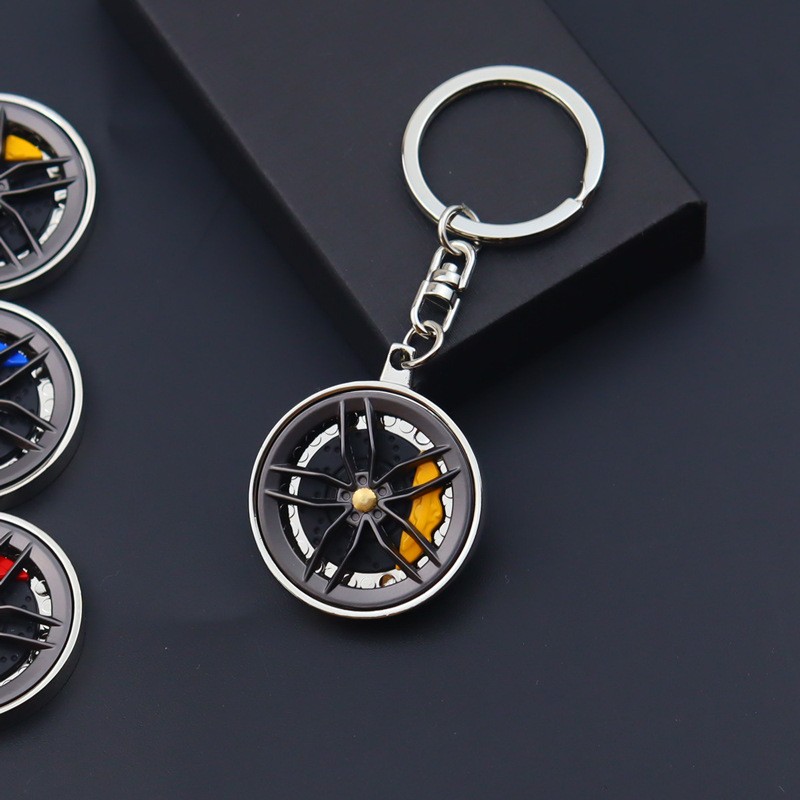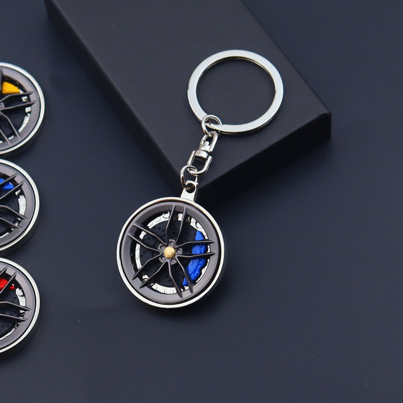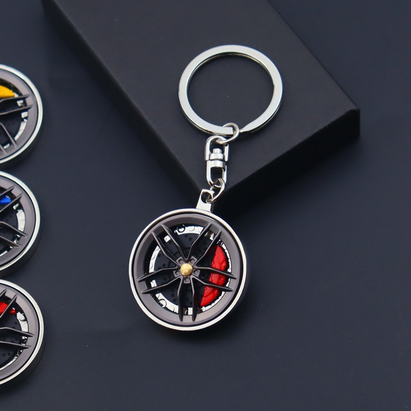 Rotating Metal Wheel Hub Keychain Creative Turntable Pendant with Caliper Brake Disc Red Blue Yellow Gift