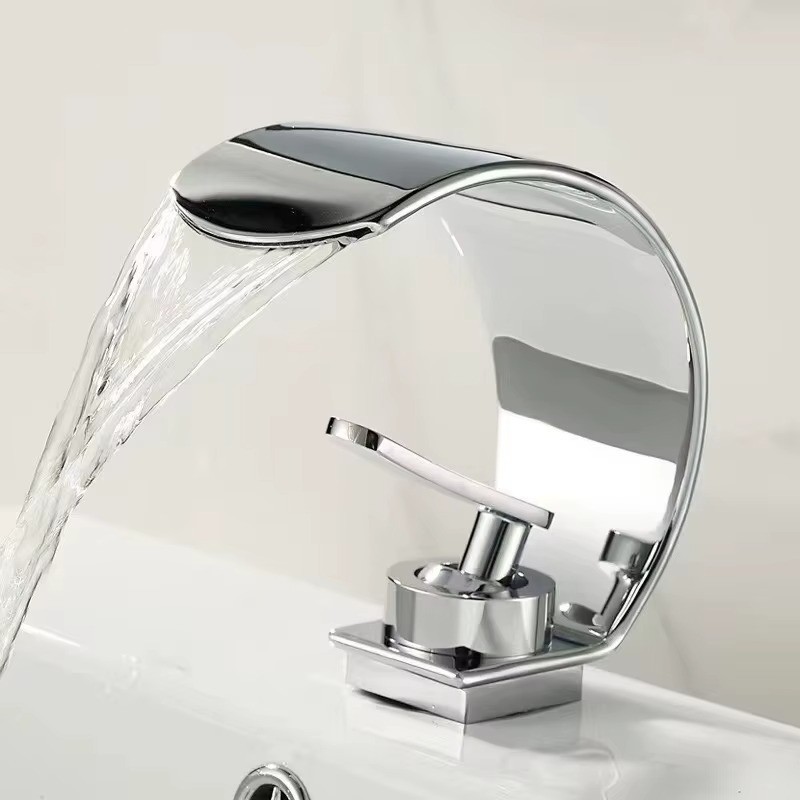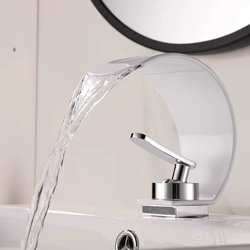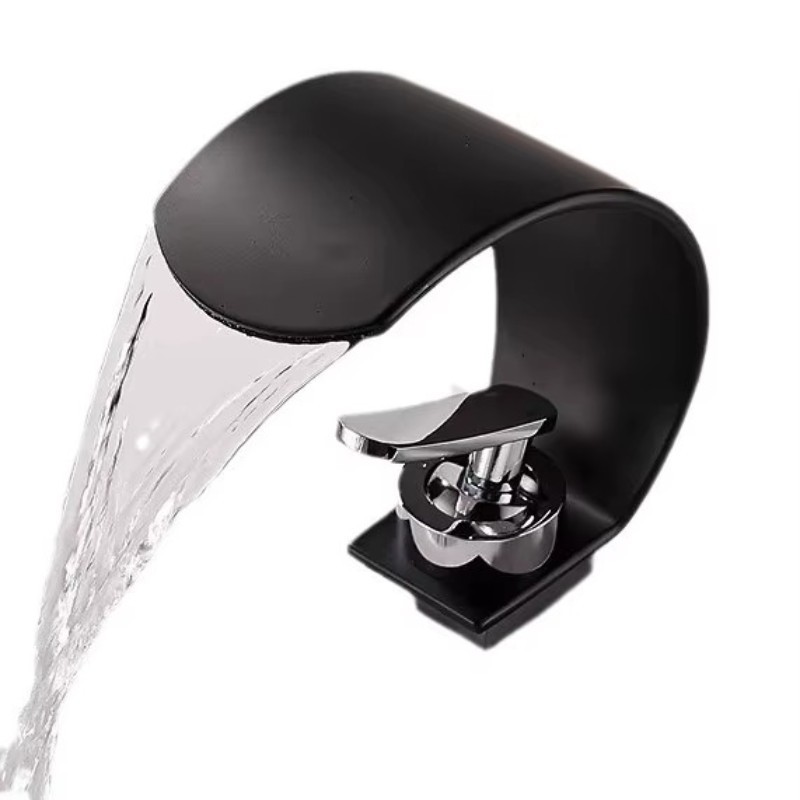 Waterfall Bathroom Faucet Sink Mixer Basin Taps Arc Spout Single Handle Washroom Faucet Deck Mounted with Cold and Hot Hose Black Chrome White Finish