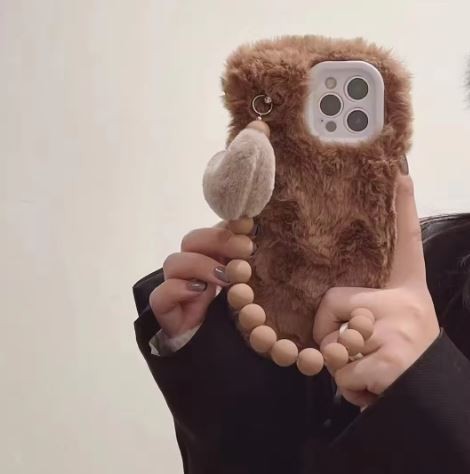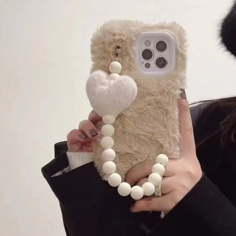 Winter Plush Heart Bracelet Phone Case for iPhone 17 Pro Max 16 Pro Max Luxury Soft Fur Protective Cover with Wrist Strap